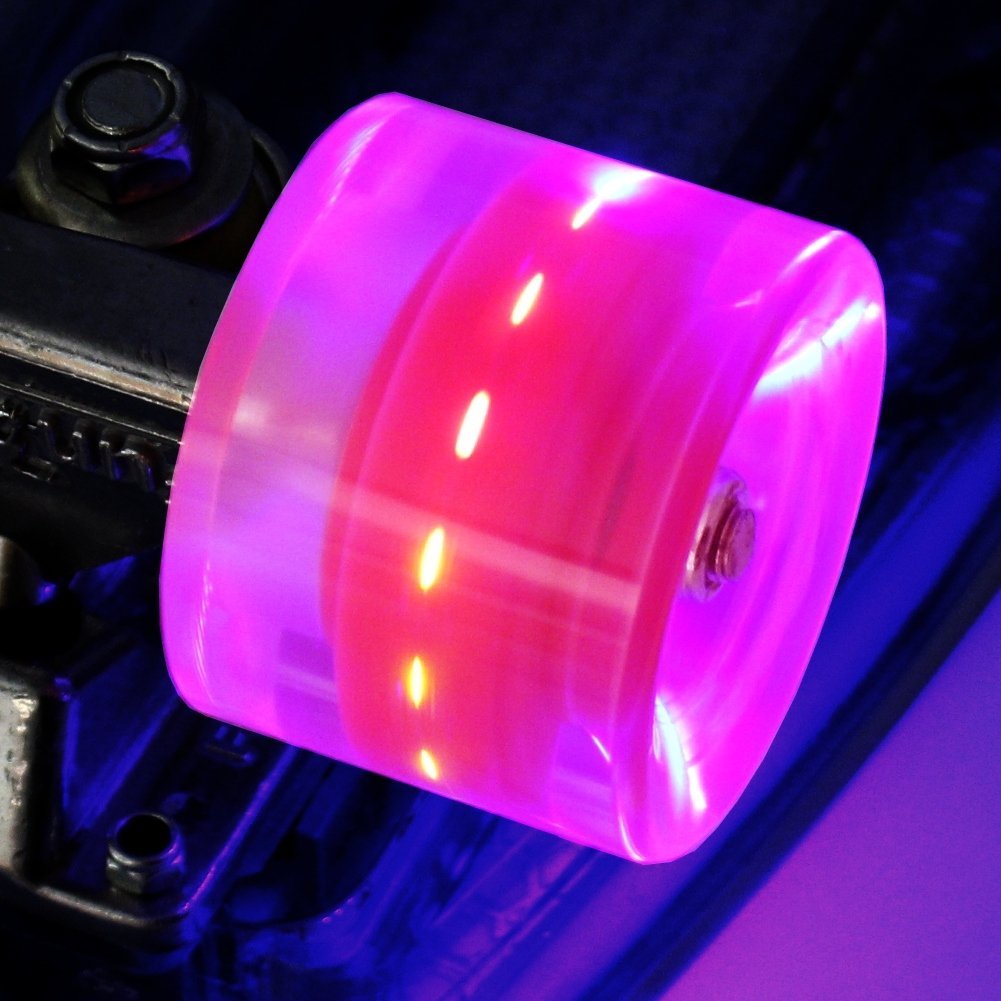 4 Stück FunTomia LED Mini-Board/Skateboard Rollen (59 × 45 mm) inklusive 8 × Mach1 ABEC-9 Kugellager und 4 × Magnet-Spacer. Diese Rollen leuchten beim Fahren bunt auf – ohne Batterien, betrieben durch einen integrierten Mini-Dynamo.