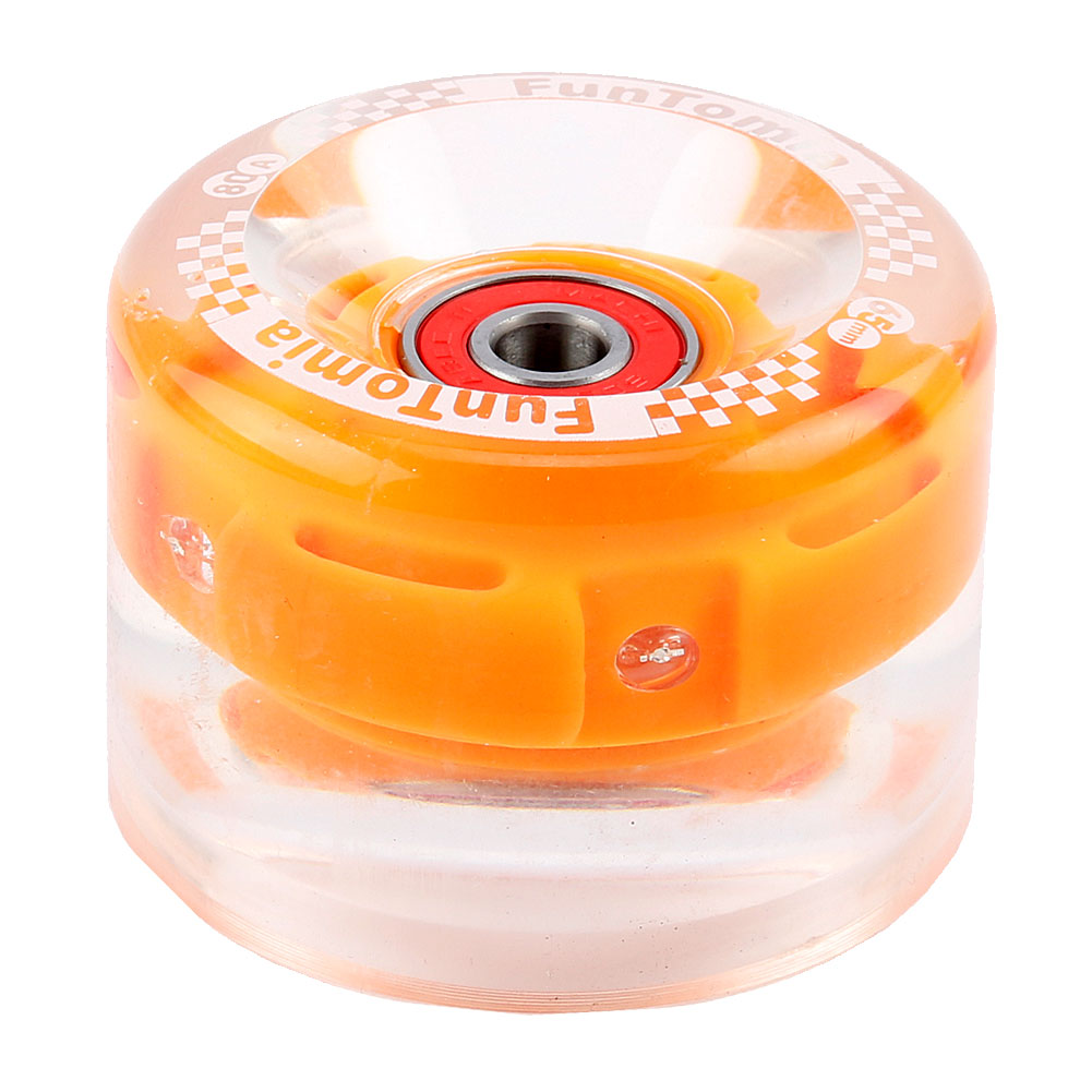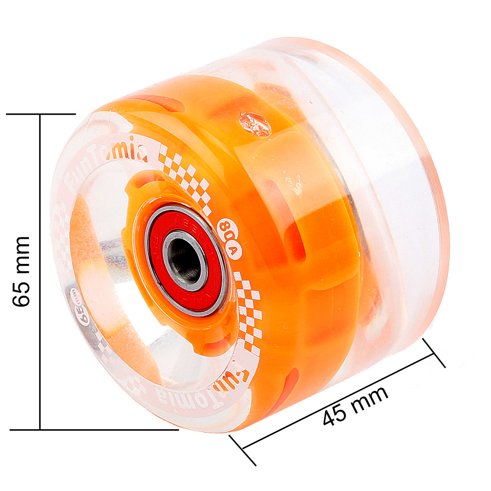 4 Stück FunTomia Miniboard/Skateboard Rollen (65 × 45 mm) mit LED inkl. 8 × Mach1 ABEC-9 Kugellager und 4 × Magnet-Spacer. Die LEDs leuchten während der Fahrt durch Magnetdynamo – ohne Batterien, wartungsfrei.