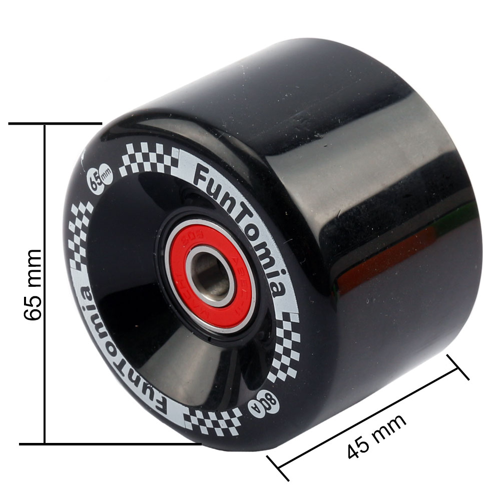 4 Stück FunTomia Miniboard / Skateboard Rollen (65 × 45 mm) inklusive 8 × Mach1 ABEC-9 Kugellager und 4 × Metall-Spacer. Die 80A Rollen bieten eine optimale Balance aus Grip und Geschwindigkeit – ideal für Cruising, Freeride und leichtes Sliden.