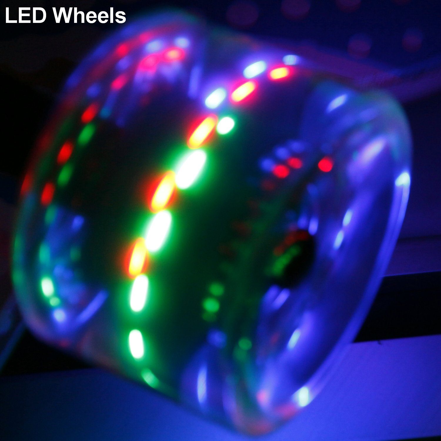 Die Camber-Form sorgt für zusätzlichen Schwung beim Antreten und unterstützt die Flexibilität des Decks. Die LED-Rollen leuchten während der Fahrt – angetrieben durch einen Magnetdynamo, ganz ohne Batterien. Das Board aus kanadischem Ahorn ist robust und flexibel – ideal für Cruising, Carving und Slides.